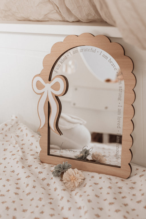 Nežno leseno ogledalo z vgraviranimi afirmacijami in imenom. Ustvarjeno kot vsakodnevni opomnik za samozavest, toplino in lepe besede. Popolno dari...