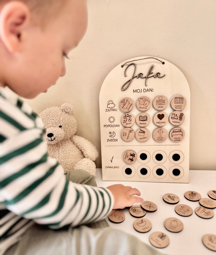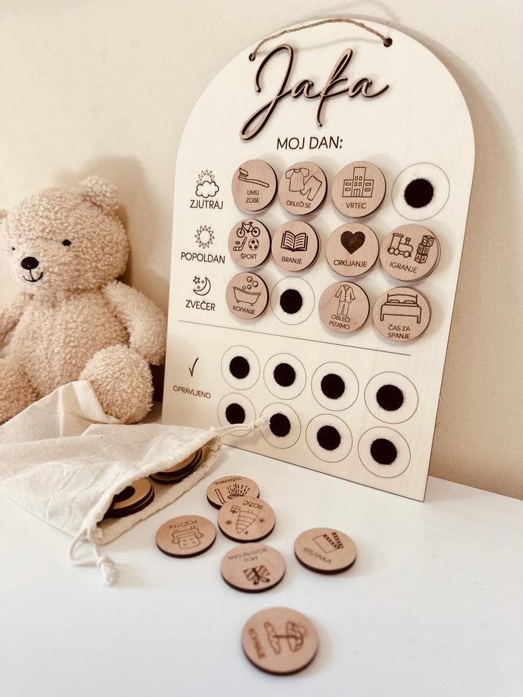 Ta izdelek je zasnovan za uvajanje dnevne rutine pri najmlajših otrocih. Na leseni plošči so zbrani različni elementi dneva, razdeljeni po dnevnih obdobjih (zjutraj, popoldan, zvečer). Vsaka dejavnost je predstavljena s simboli na lesenih žetonih, ki jih otrok lahko postavlja na ustrezna mesta glede na potek dneva. Na ta način otrok vizualno spremlja svoje obveznosti in dejavnosti, kot so oblačenje, vrtec, igra, šport, in branje. Žetoni pomagajo otroku razumeti in vzpostaviti rutino ter olajšujejo prehod med posameznimi aktivnostmi.