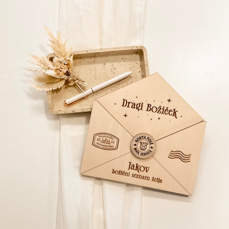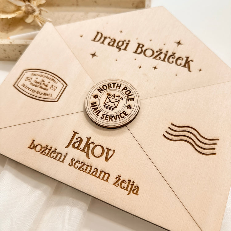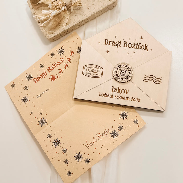 Nastavi pismo Božičku v personalizirano leseno kuverto in si zagotovi, da jo res prejme!