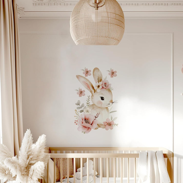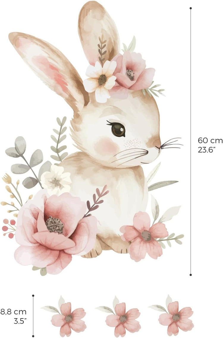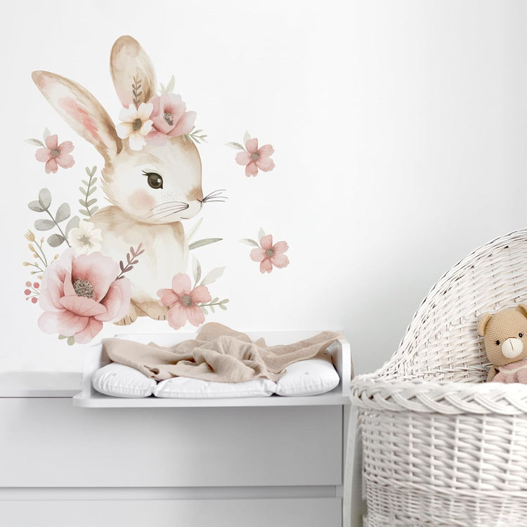 Prinesite nežnost in toplino v otroško sobico s to čudovito stensko nalepko! Akvarelni zajček, obdan z nežnimi cvetlicami v pastelnih odtenkih, bo prostoru dodal pravljični pridih in ustvaril prijetno, umirjeno vzdušje.