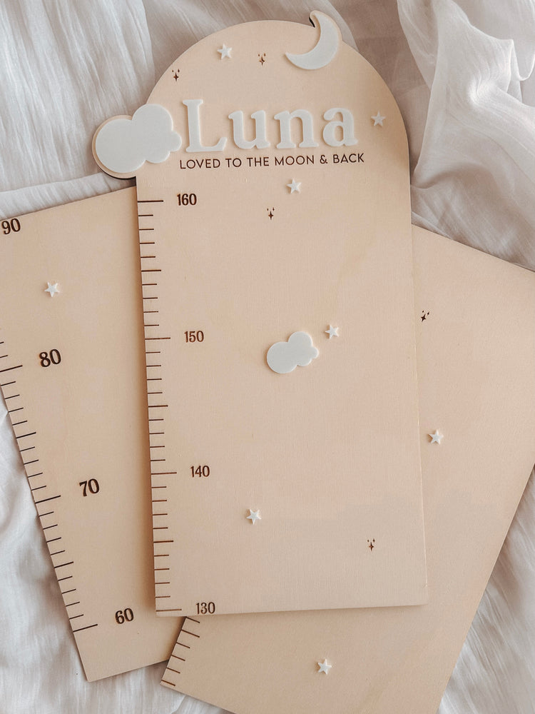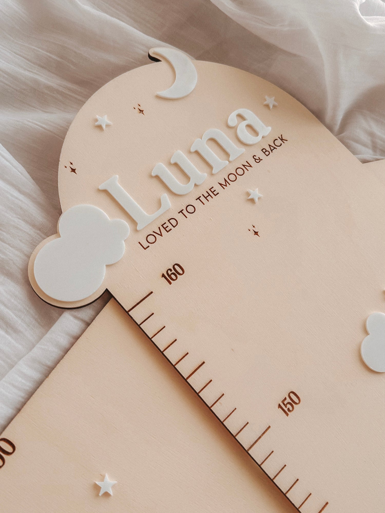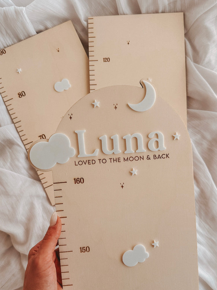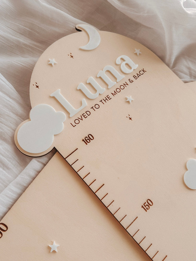 Ujemite dragocene trenutke odraščanja svojega malčka s čudovitim stenskim metrom, ki združuje naravno toplino lesa in eleganten akrilni napis ter dodatki.